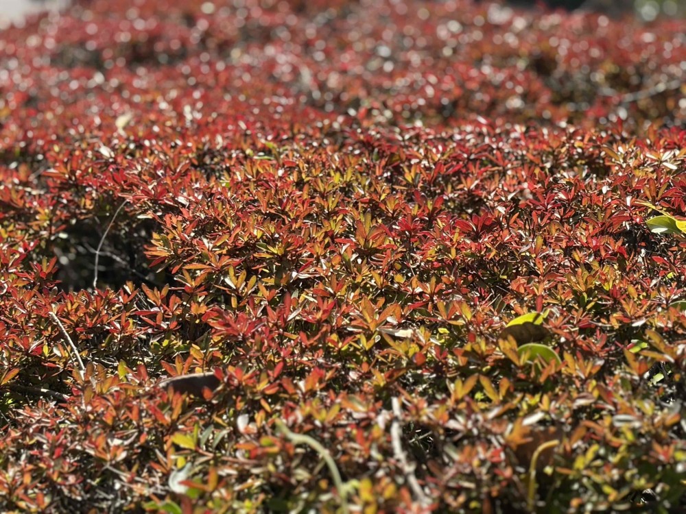 つつじでしょうか?きれいに手入れされている赤い葉っぱの植物。大事に手入れされているので、めいっぱいきれいな葉っぱをつけて人間を楽しませようとしてくれてるのかな。